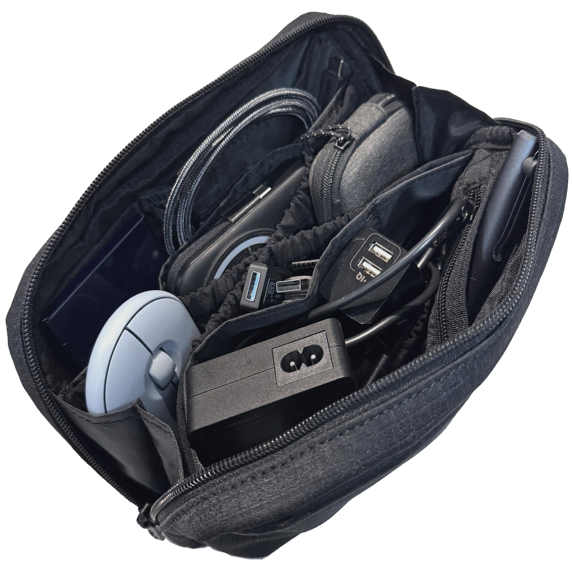 ・ストレッチポケット付でマウスやモバイルバッテリーの収納もぴったりフィット。一部ジッパーポケットも備え、フラッシュメモリーなどの小物も安心して収納できます。